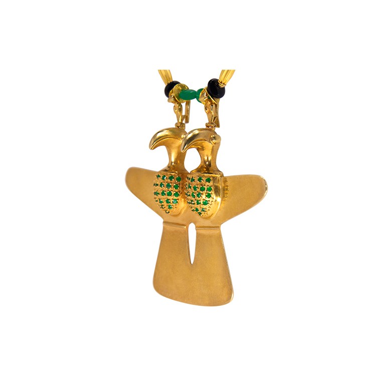 This specific design is very interesting in the meaning “INSEPARABLE” due to the two heads together in one body. Related in our lives to feel that will never take oneself off from. The pectorals of each bird adorned with the emeralds create a refined design. Note that the two bails where the piece hangs are two Birds as well.