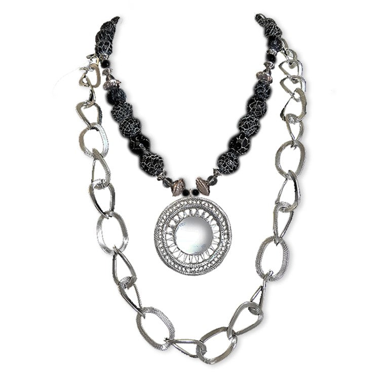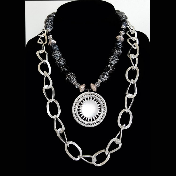- Metal: Sterling Silver Pendant, Sterling Silver and Pewter separators and Aluminum Chain.